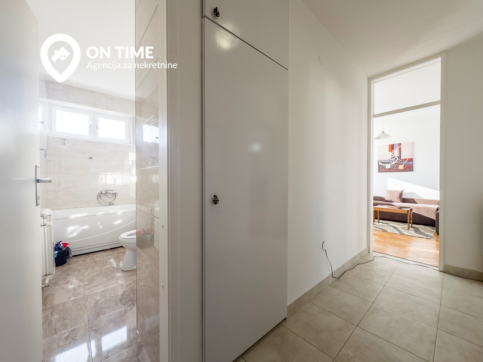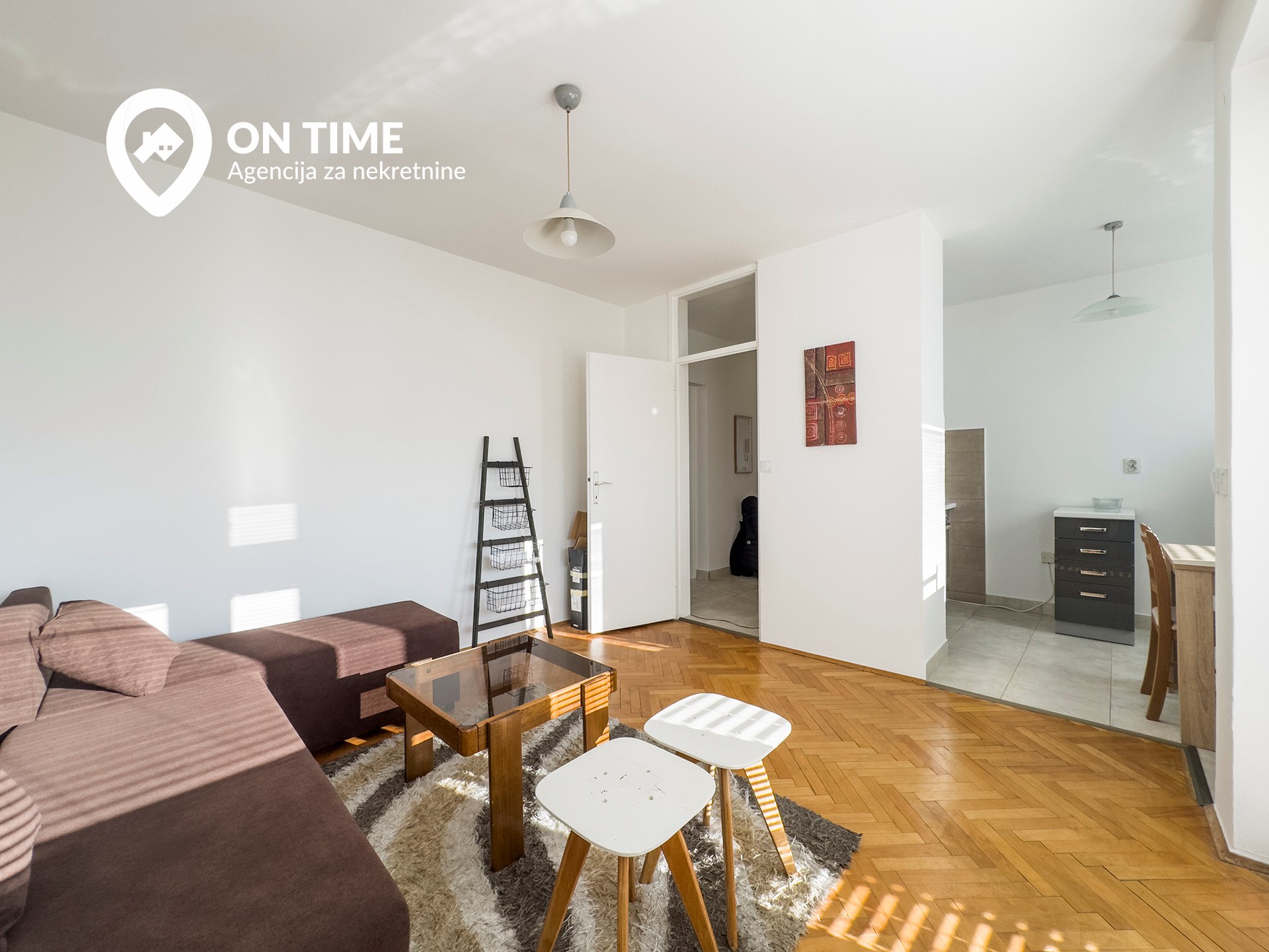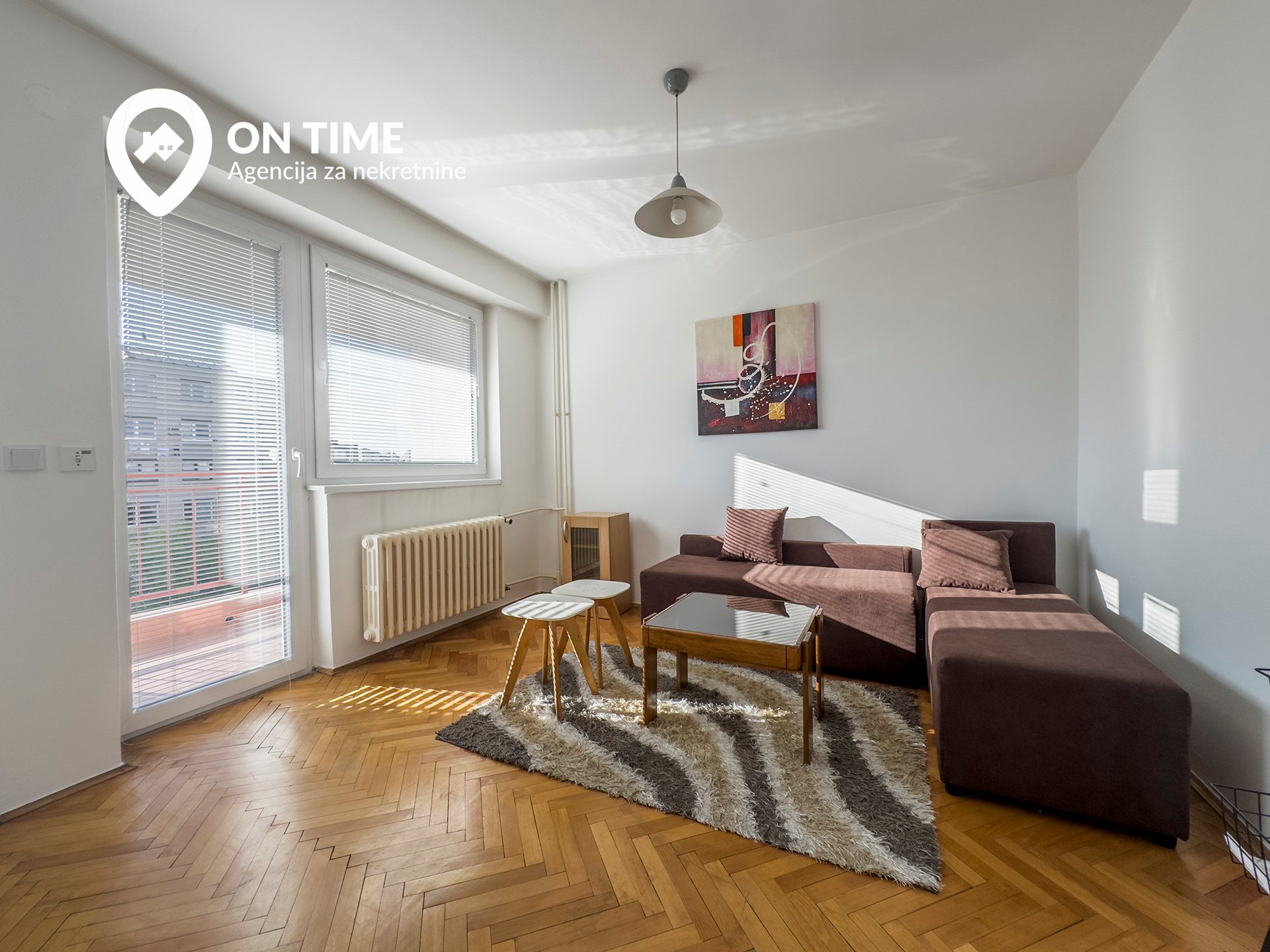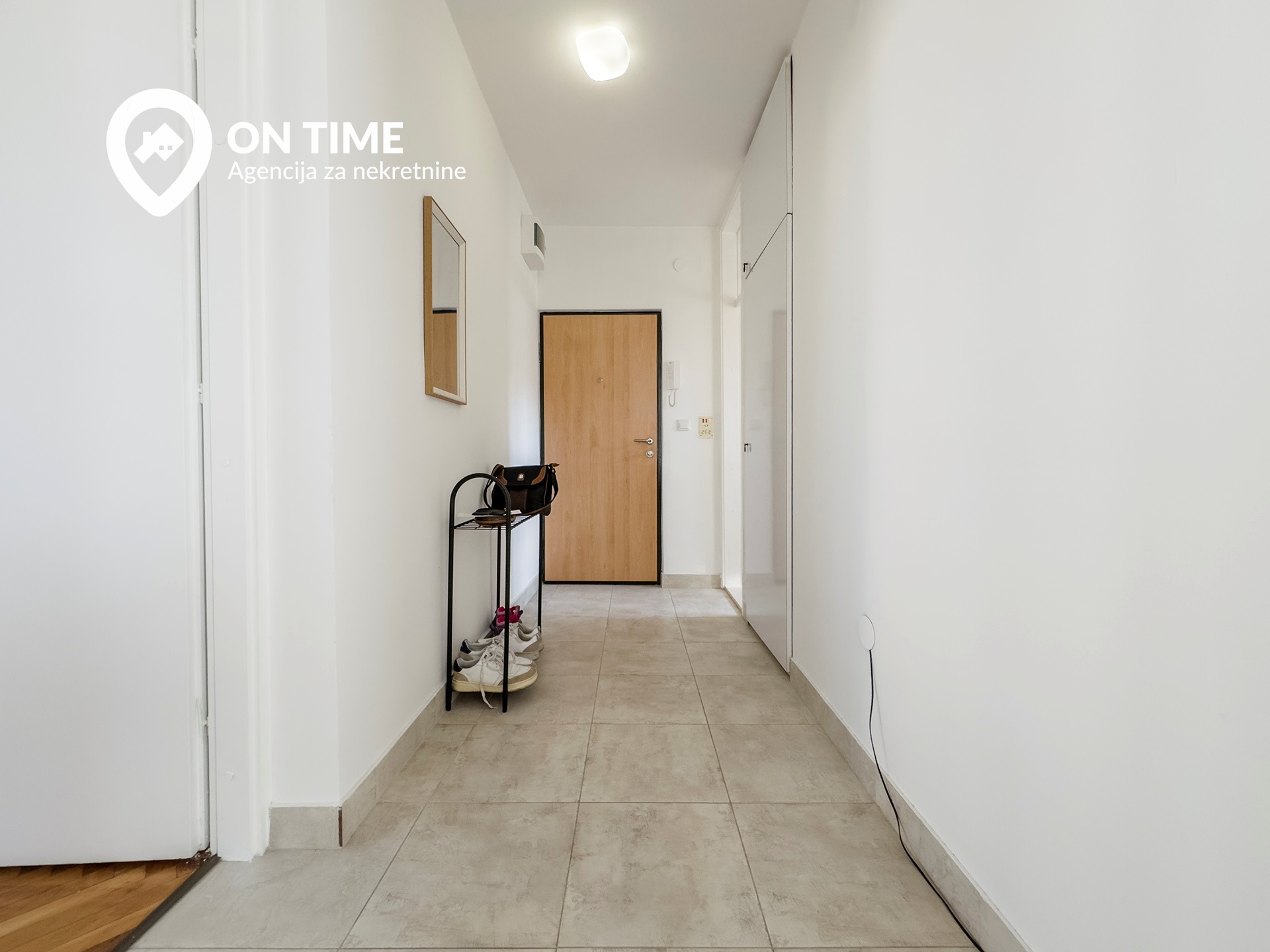 Stan se sastoji od dnevnog boravka sa trpezarijom, kuhinje, spavaće sobe, kupatila, hodnika i dva balkona.