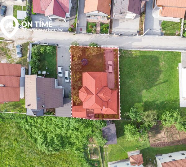 Projektovani slobodno stojeći stambeni objekt je pozicioniran na parceli cca: 500m2, tako da omogućava njeno maksimalno iskorištenje, uz težnju da se na naruši planirani nivo kvaliteta stanovanja neposrednog susjedstva. Dodatnu notu privatnosti dopunjava betonski zid oko objekta, a ugođaj šadrvan sa kaminom.