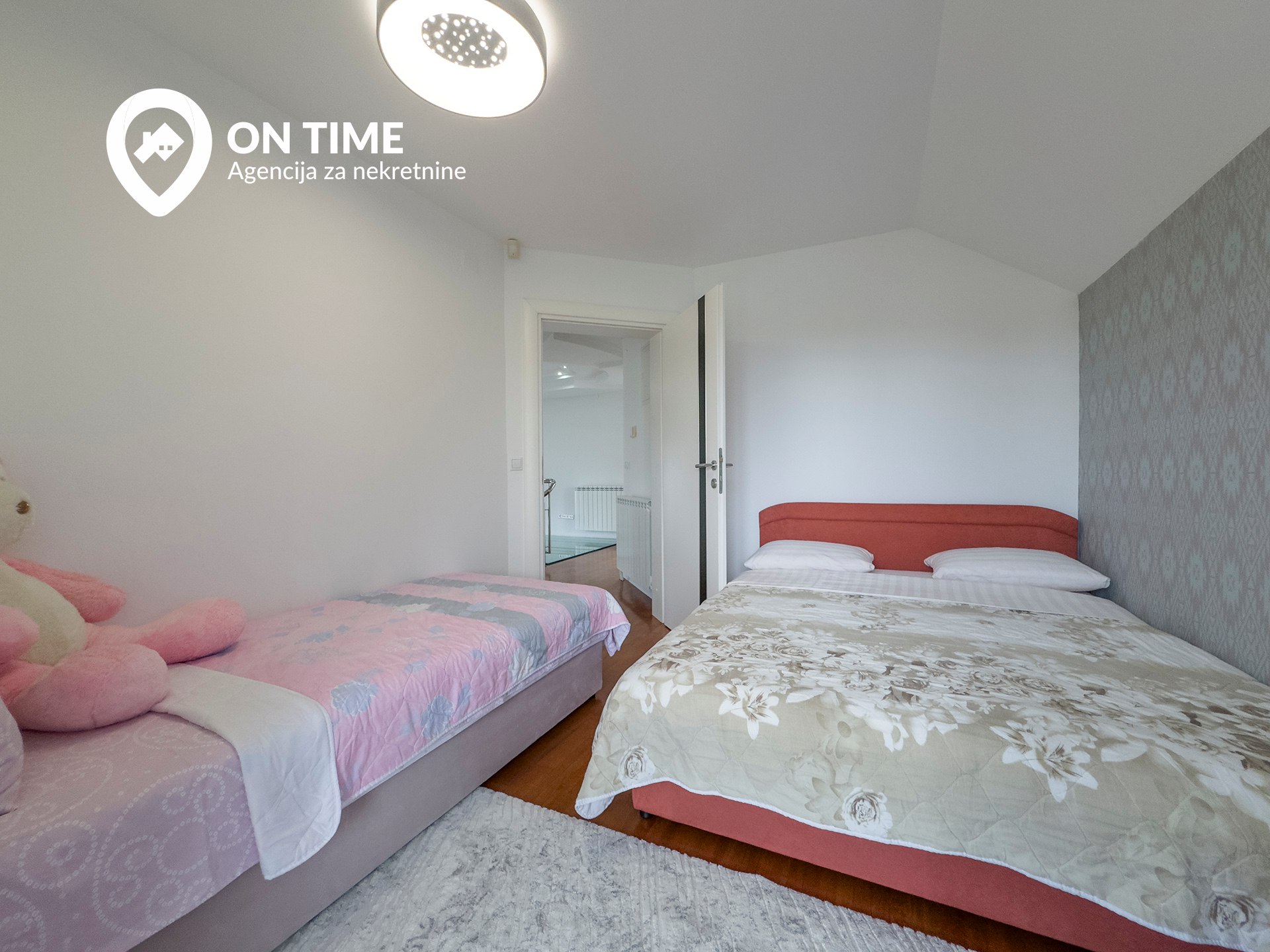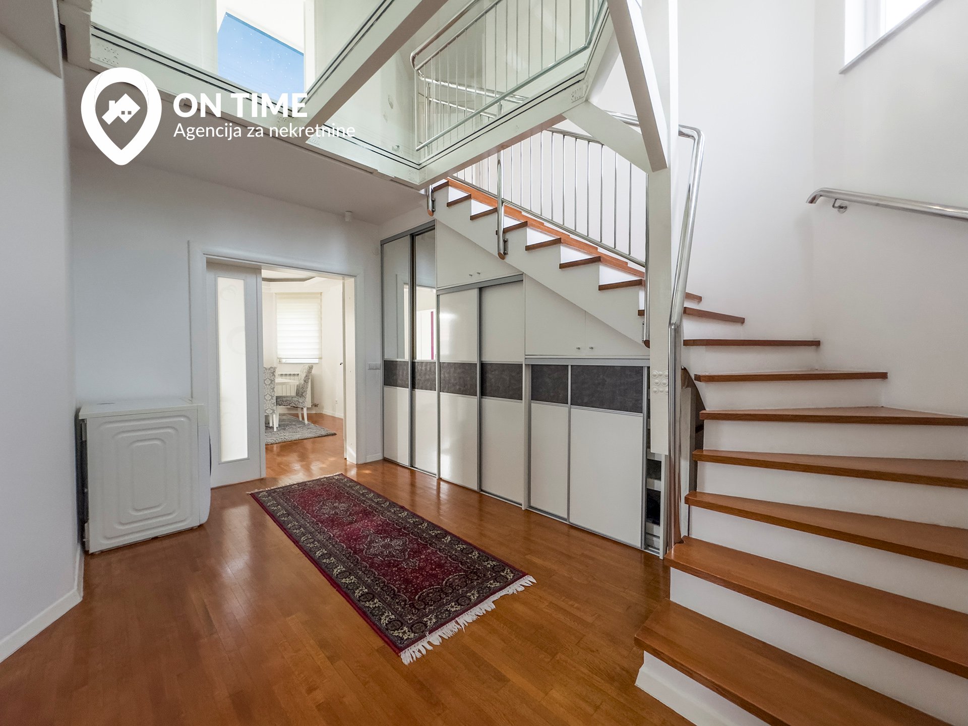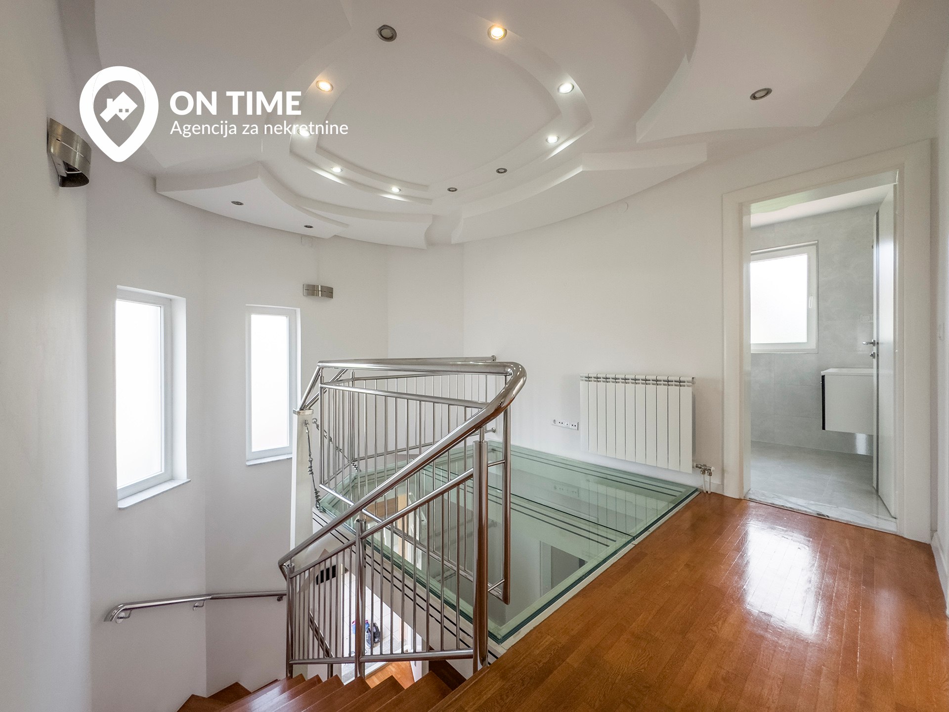 - Prvi sprat: tri spavaće soba, degažman, kupatilo, dva balkona i galerija sa staklenim podom